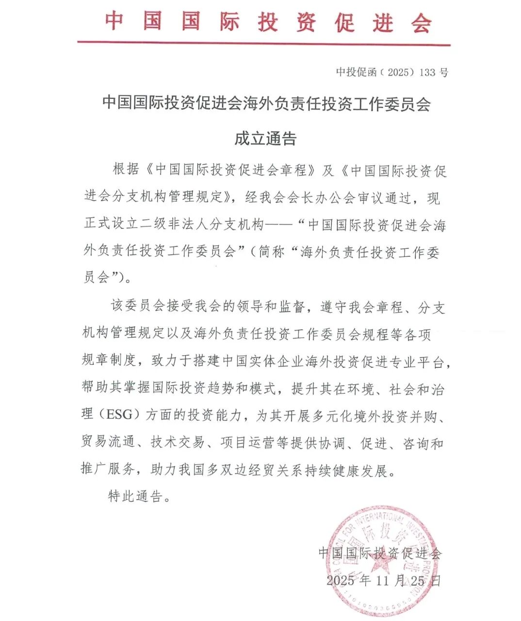中国国际投资促进会海外负责任投资工作委员会成立通告